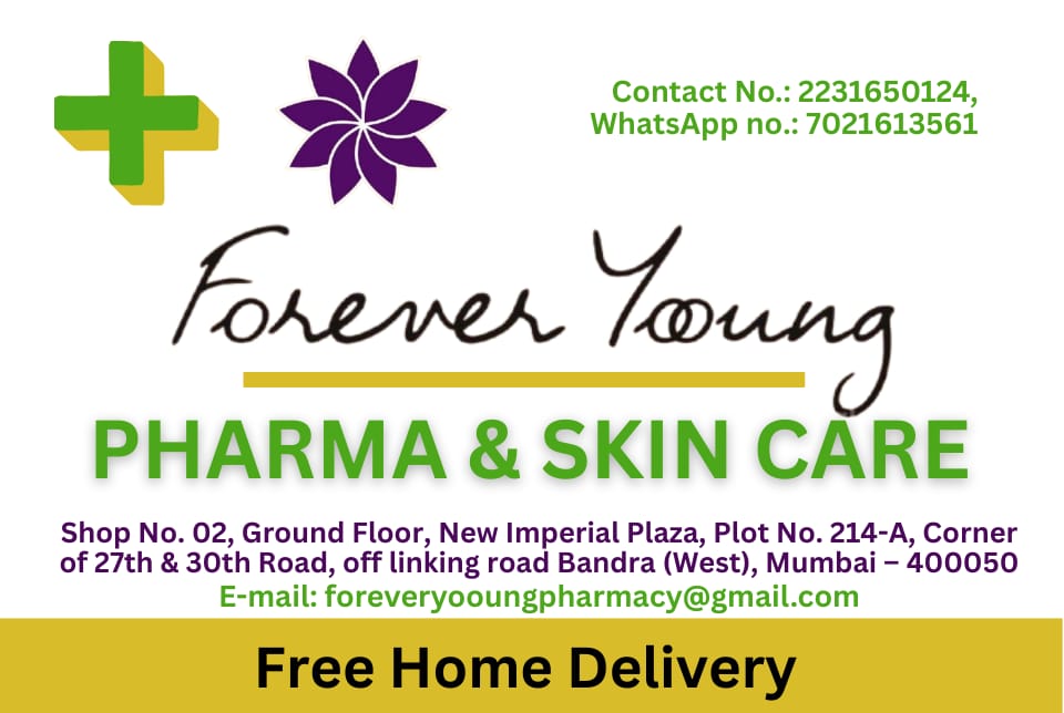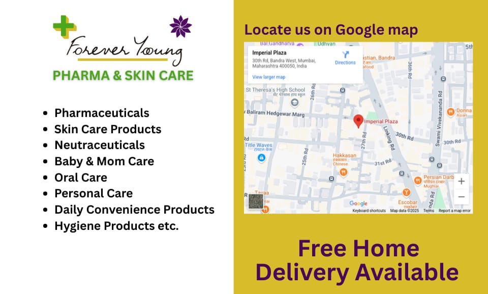 Forever Yooung Pharma & Skin Care is your trusted partner in wellness and beauty. Backed by dermatology and pharmacy experts, we offer FDA/FSSAI-approved skincare, health supplements, and wellness products from top brands. Visit our Bandra West outlet — where science meets care, and beauty begins with well-being. Forever Yooung — your lifestyle of wellness.